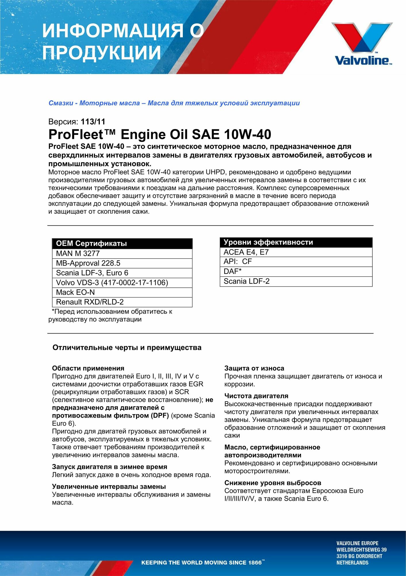 Синтетическое моторное масло PROFLEET 10W40, 20 л. информация: