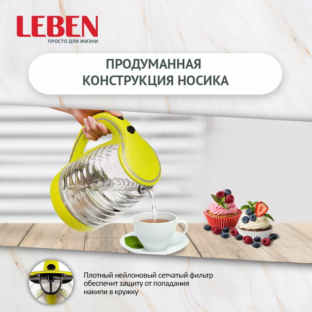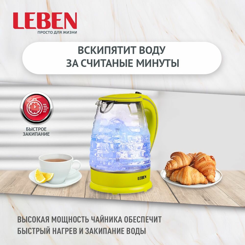 Чайник электрический 1,7л, 1850Вт, скрытый нагр.элемент, стекло, рифлёное стекло, LEBEN информация: