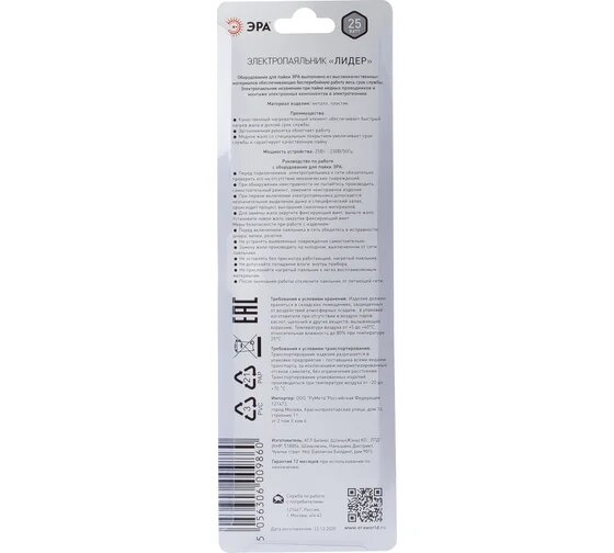 ЭРА Паяльник Лидер с 2комп. рукоятка, жало Long life 230 В 25 Вт PL0225 W Б0046945 информация: