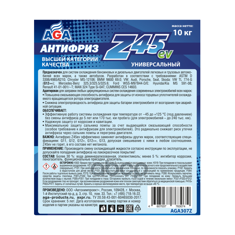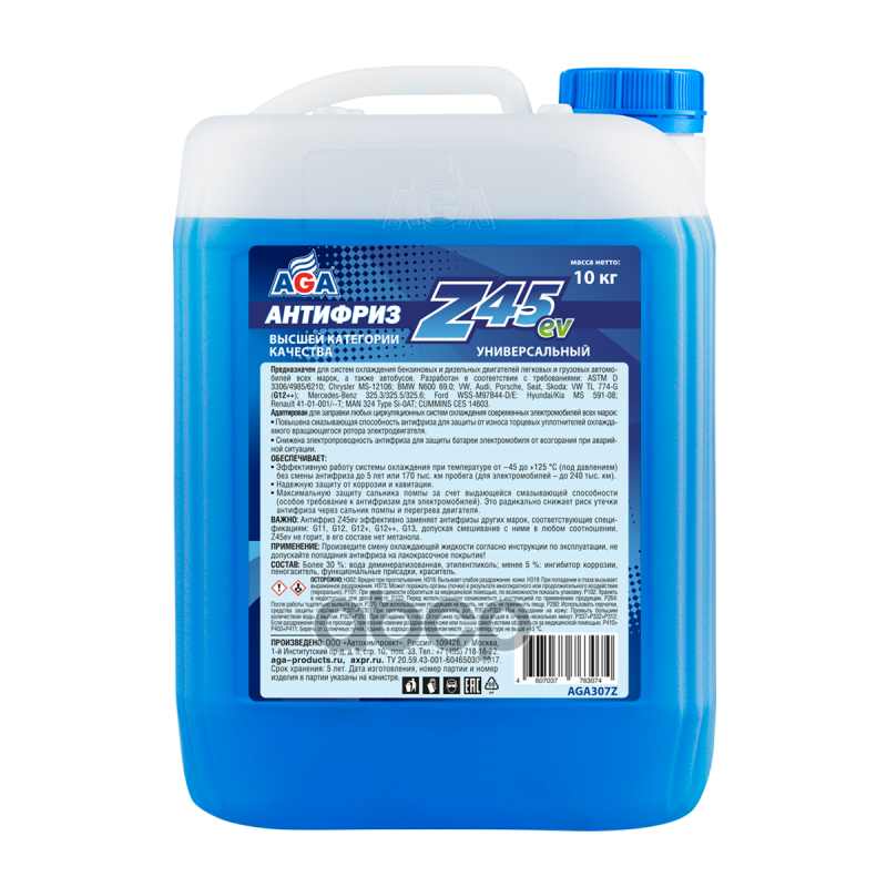 Антифриз Aga Z45 G12++ Готовый -45C Синий 1 Кг Aga305z (Допуск Для Электромобилей) Aga Арт. Aga305z AGA арт. AGA305Z