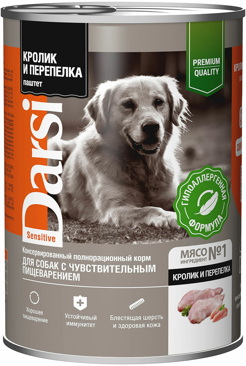 DARSI SENSITIVE DOG для взрослых собак с чувствительным пищеварением паштет с кроликом и перепелкой (410 гр х 9 шт)
