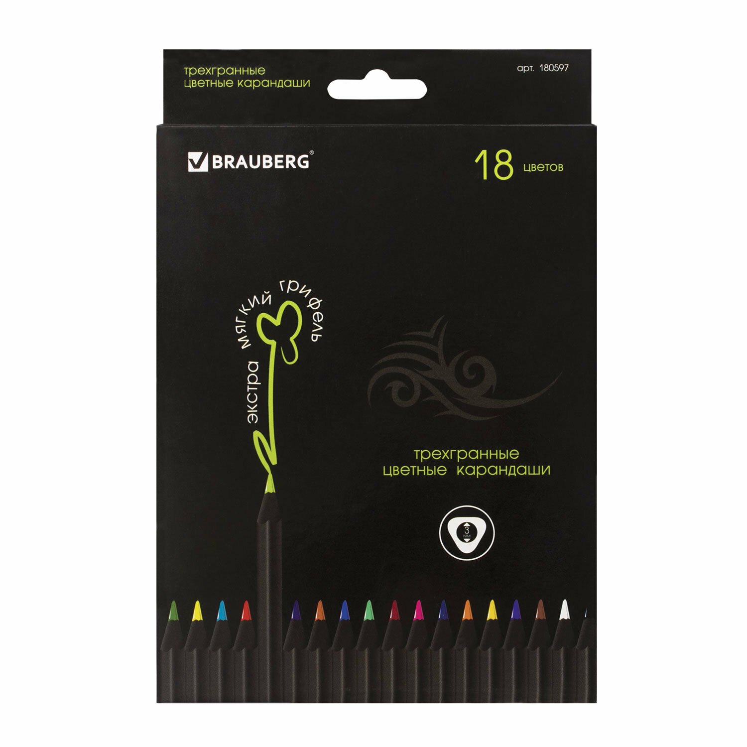 Карандаши цветные Brauberg "Black Jack", 18 цветов, трехгранные, черное дерево (180597) информация: