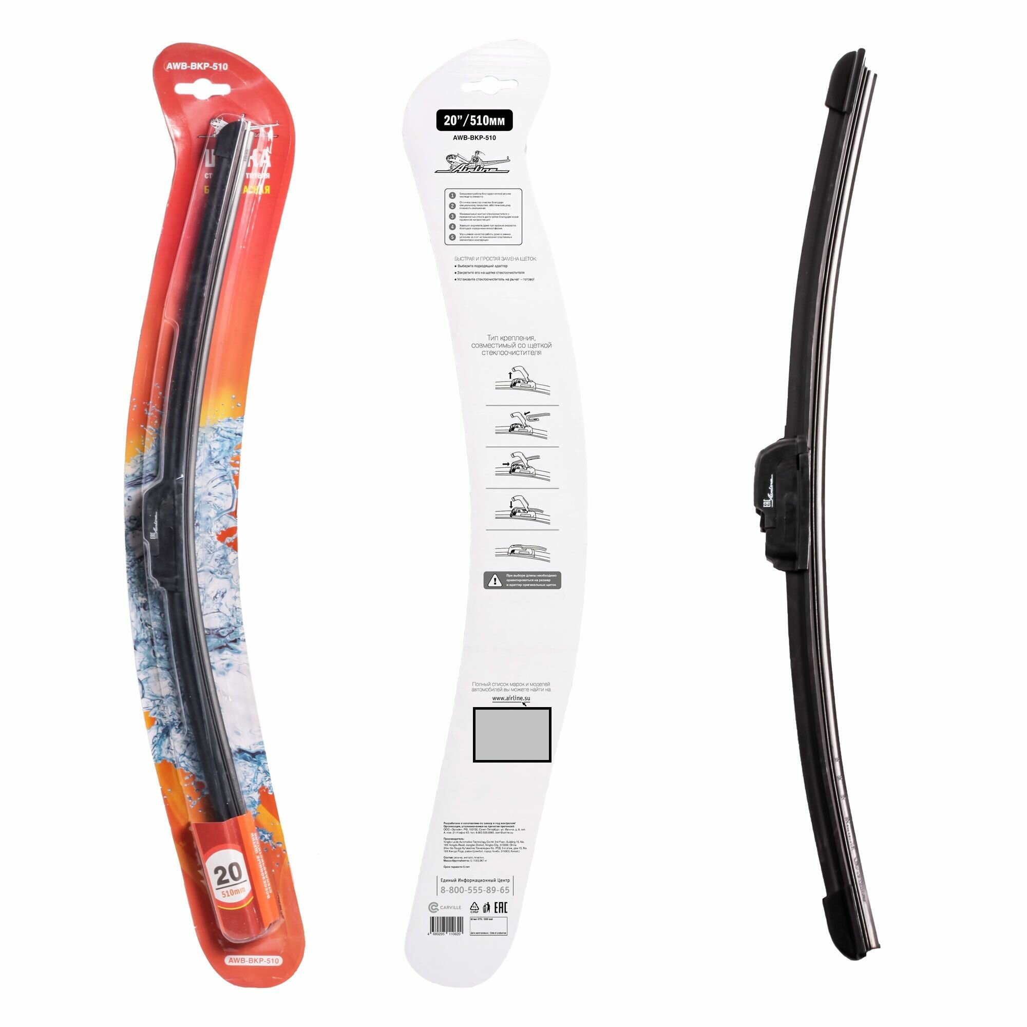 Щетка стеклоочистителя бескаркас 510мм (20") 1 адаптер (hook 9x3) AIRLINE AWB-BKP-510 информация: