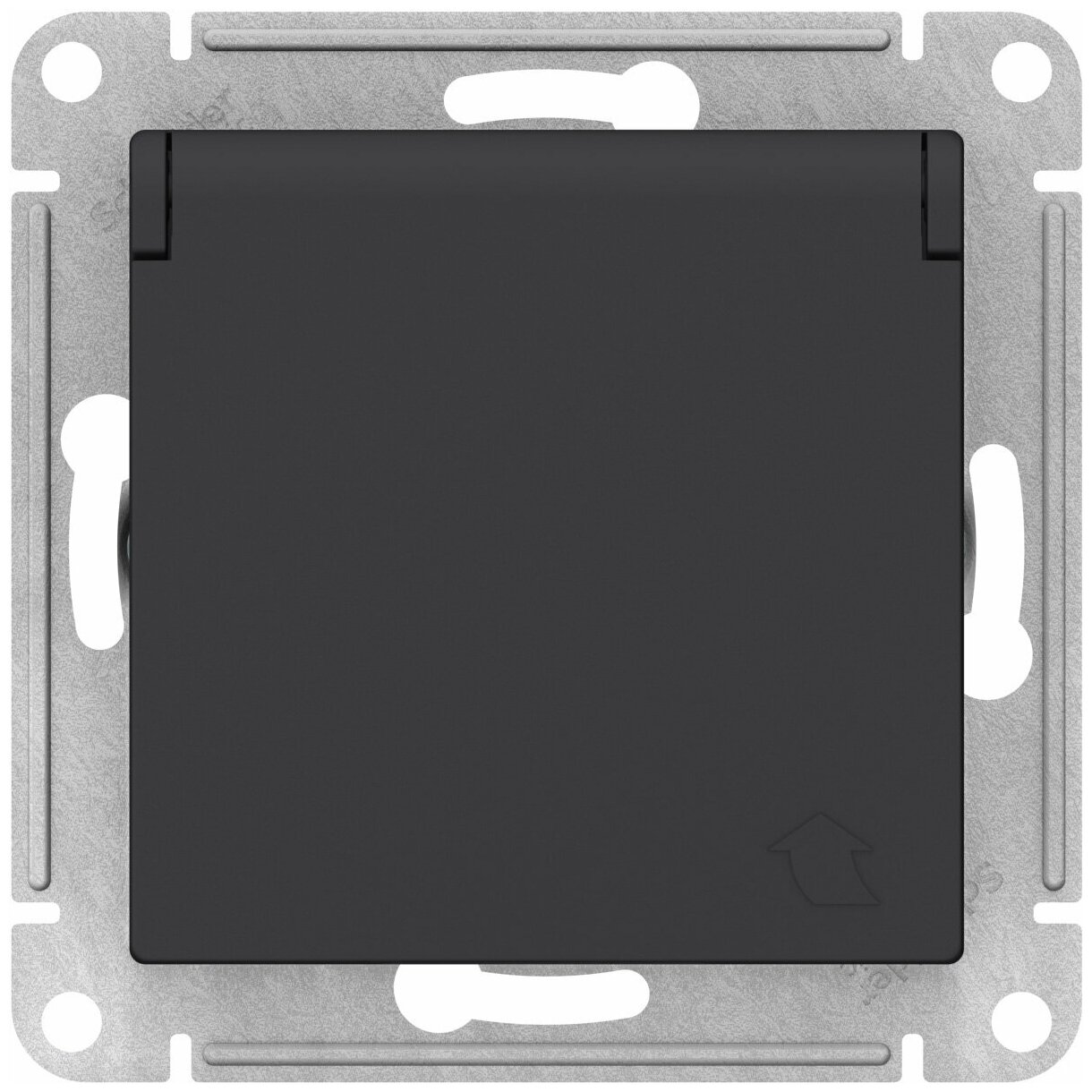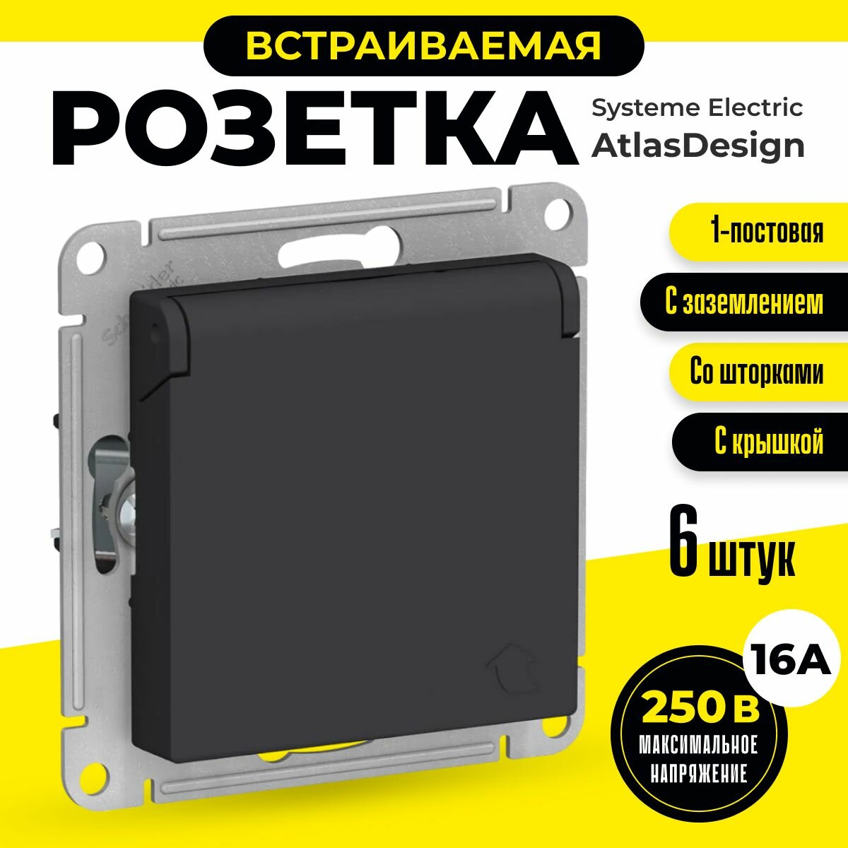 Механизм розетки Schneider Electric AtlasDesign с заземлением, с защитными шторками, с крышкой, цвет Карбон (черный) (комплект 6шт)