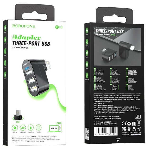 USB HUB 3USB 2.0 Borofone DH3 Black информация: