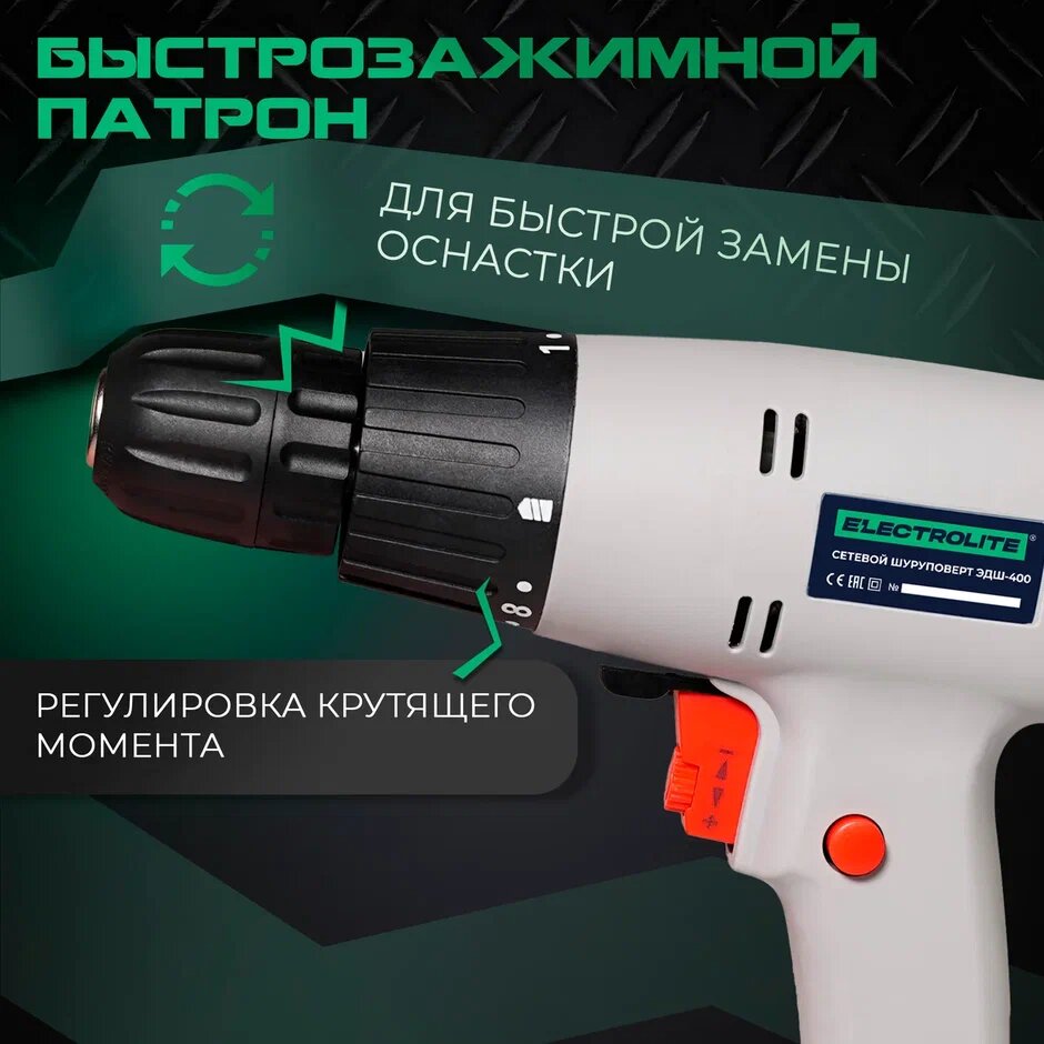 Шуруповерт электрический / дрель электрическая безударная Electrolite ЭДШ-400 15 Н*м 800 об/мин информация: