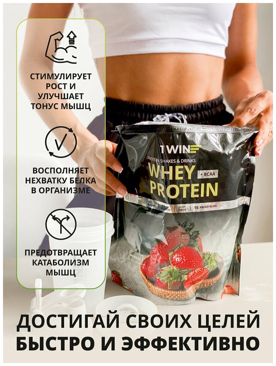 10 цен на 1WIN Протеин Whey Protein, Сывороточный белковый коктейль для похудения, без сахара, Клубника, 900 г.