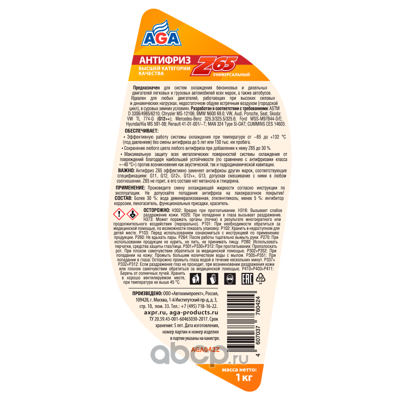 Антифриз AGA Z65 AGA042Z, желтый,готовый к применению,1 кг.