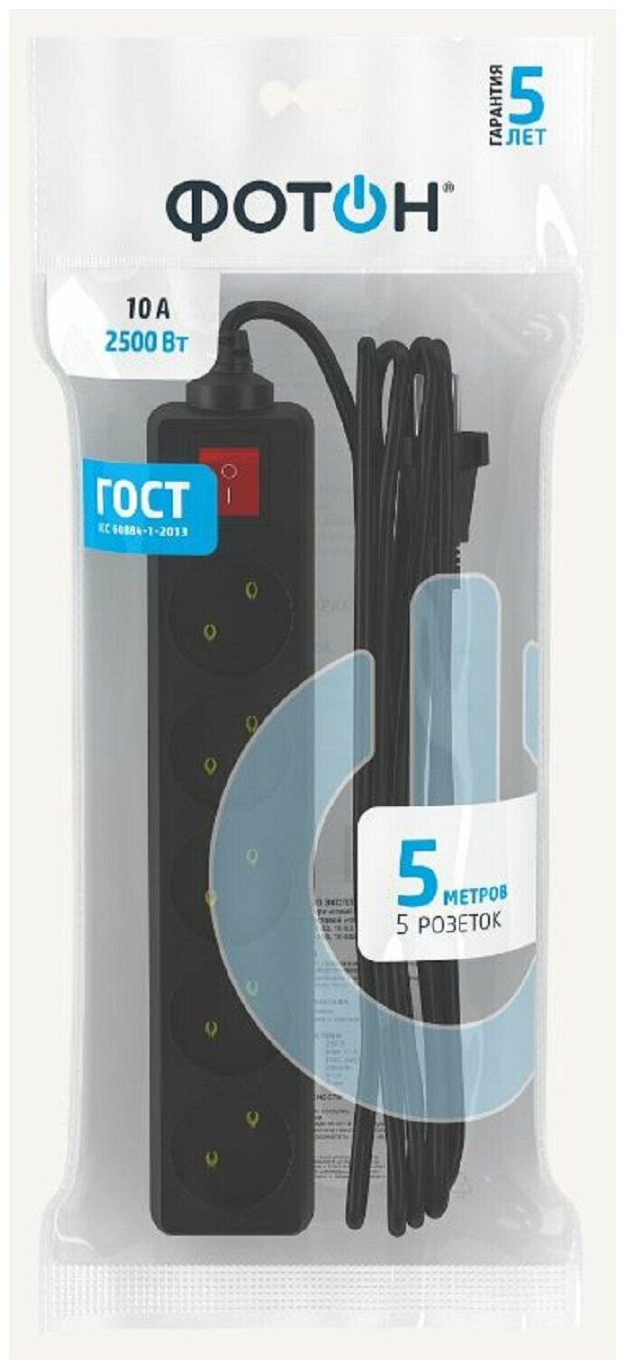 Фотон Удлинитель сетевой 10-55S, 5м, 5 розеток, 10А, с выключателем, Черный 22728 информация: