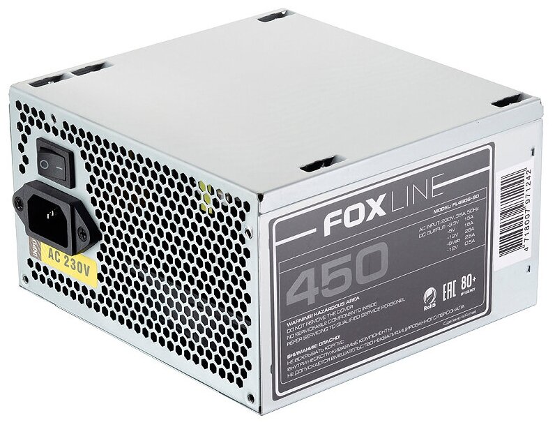 Отзывы на Блок питания Foxline , 450W, ATX, APFC, 120FAN, CPU 4+4 pin, MB 24pin, 5xSATA, 2xPATA, 1xFDD, 1xPCI-E 6pin, 80+ (FL450S-80)