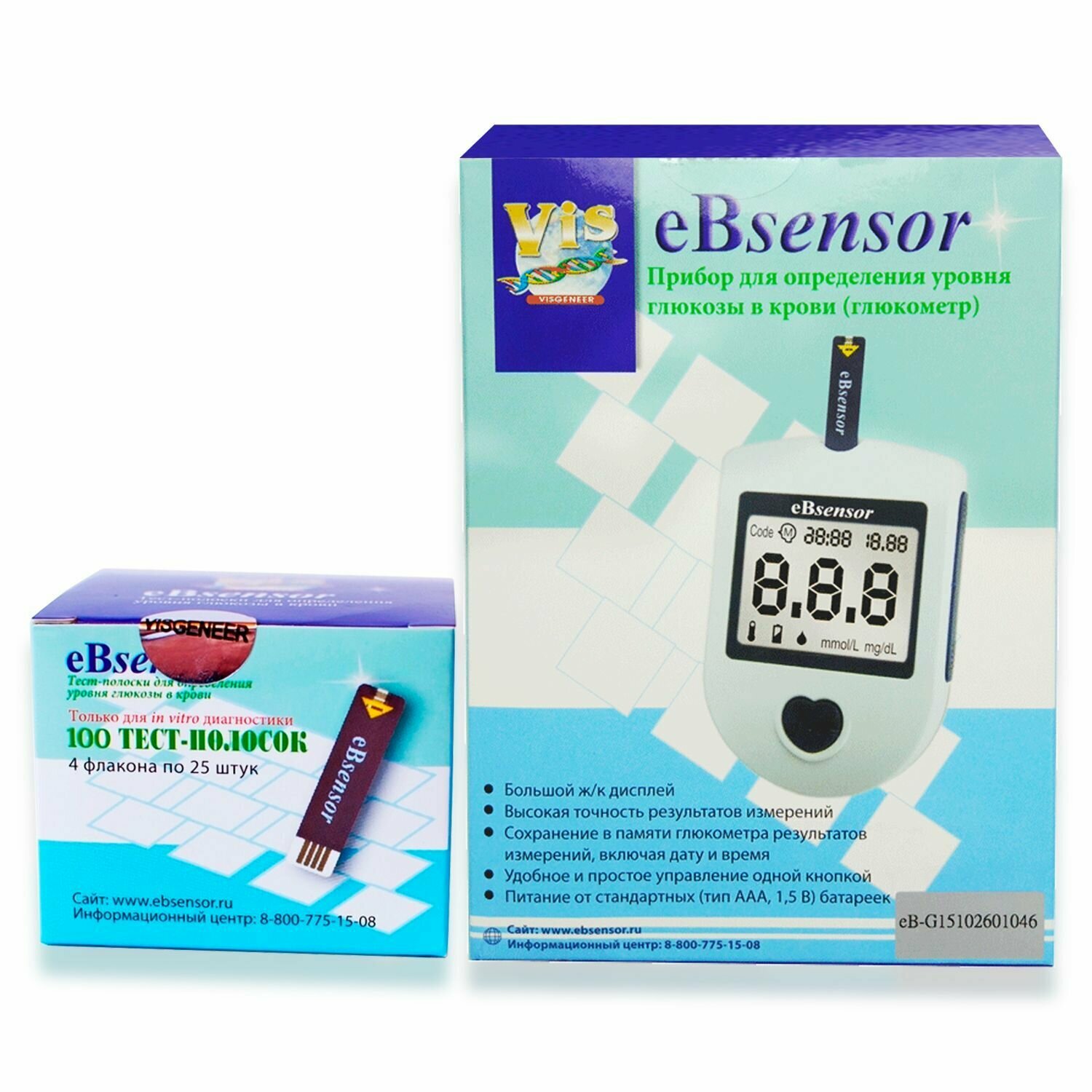 Глюкометр eBsensor + тест-полоски 100 штук (4 тубы по 25 штук)