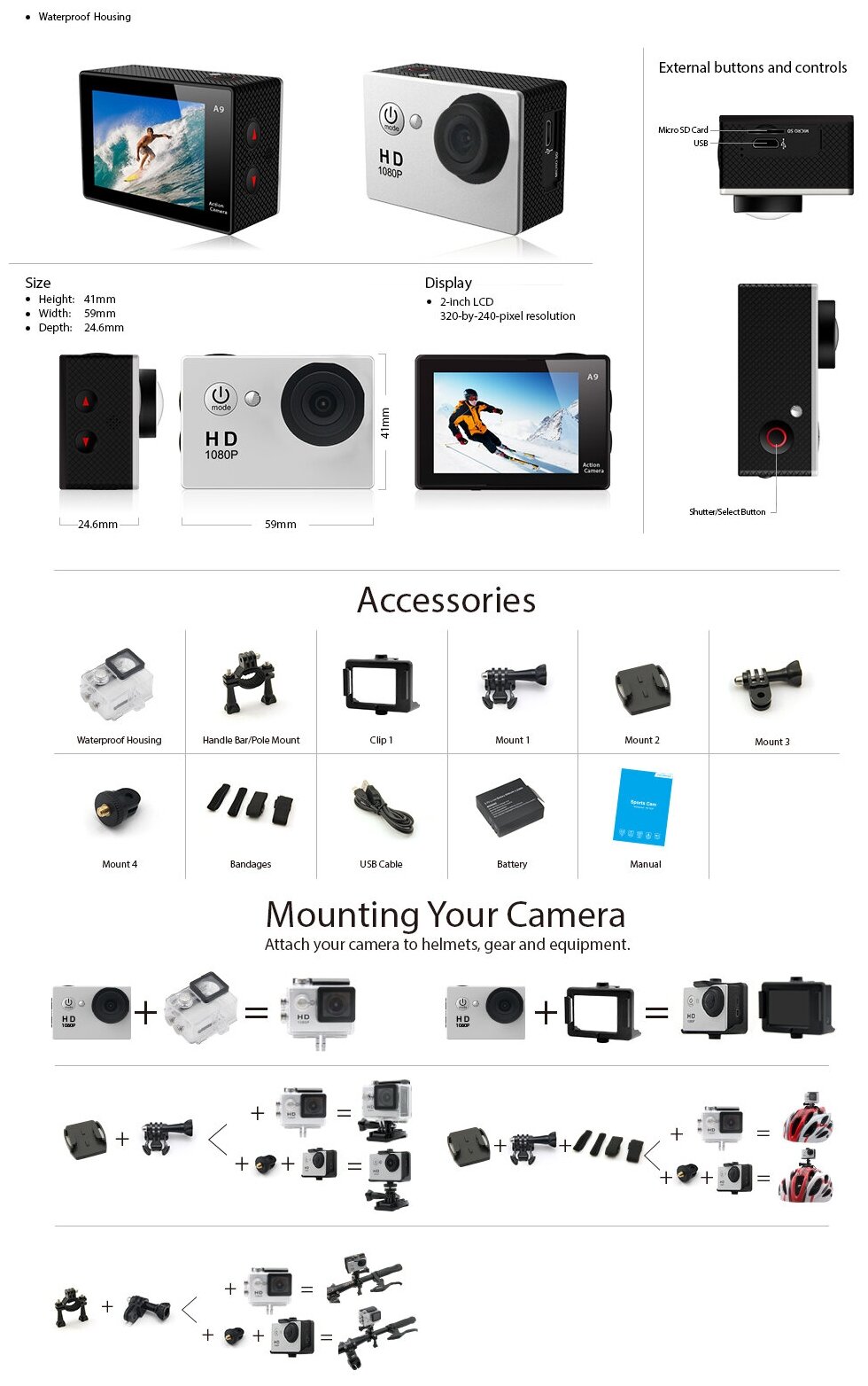 | Комплектация | 1. Цифровая экшн-камера HD PRO1080P; 2. SD-карта 16G; 3. Водонепроницаемый корпус; 4. Разнообразные крепления (очень много); 5. Рамка для камеры; 6. USB кабель; 7. Аккумулятор 8. Инструкция |