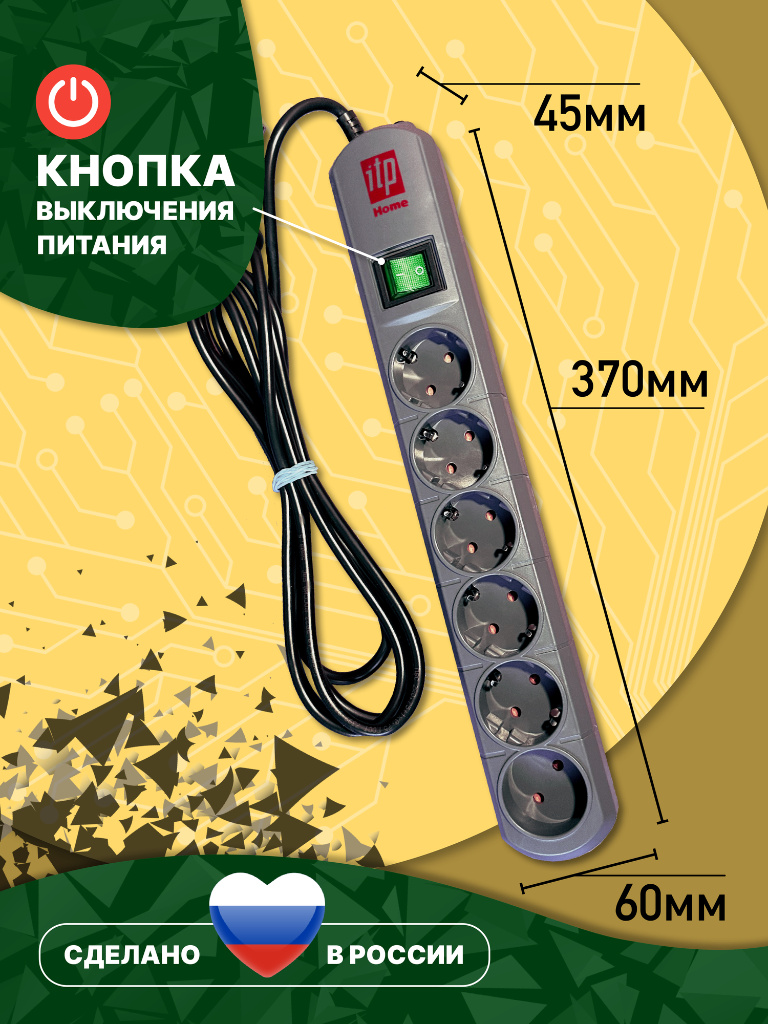 Сетевой фильтр ITP HOME , 6 розеток, кабель 5 метров , 10 ампер, 2200 Ватт, Россия. 1 540 ₽