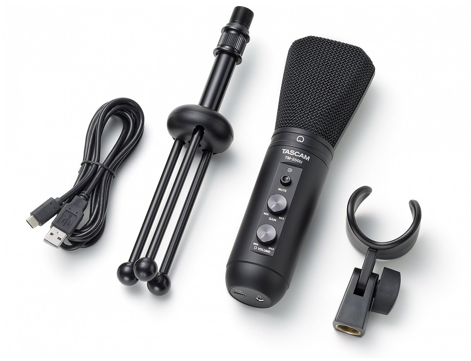 Tascam TM-250U Универсальный USB конденсаторный микрофон, совместим с PC, Mac, iPad и Android, супер-кардиоидный, 20Hz - 20kHz, выход на наушники, в комплект входит микрофон, USB кабель, держатель микрофона и настольная стойка. информация: