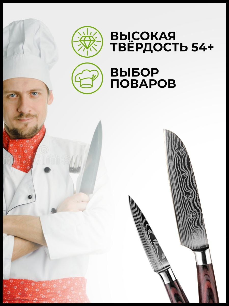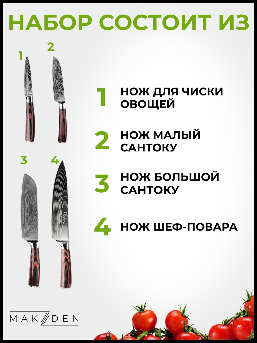 | Типы ножей в наборе | нож для овощей, нож сантоку, универсальный нож, шеф-нож |