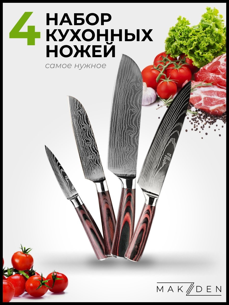 Набор кухонных ножей MAKZDEN с дамасским узором, 4шт информация: