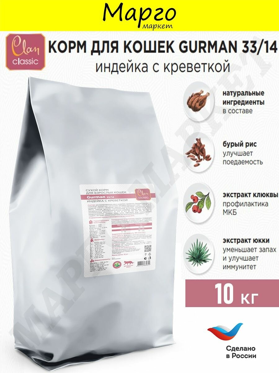 CLAN CLASSIC Gurman-33/14 для кошек привередливых Индейка и креветки 10кг 6 233 ₽