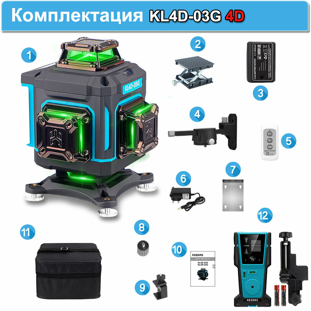 Лазерный уровень Kezers KL4D-03G, Зеленый луч 360 4D 16 Линий, С 2-мя литиевыми батареями емкостью 4000 мАч Чемодан, С приемником KL-1D 12 999 ₽