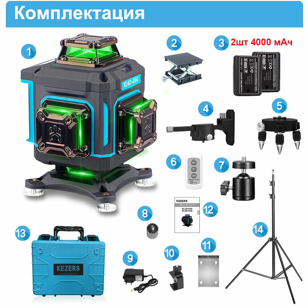Лазерный уровень Kezers KL4D-03G, Зеленый луч 360 4D 16 Линий, С 2-мя литиевыми батареями 4000 мАч,штатив 1,6 м,Чемодан информация: