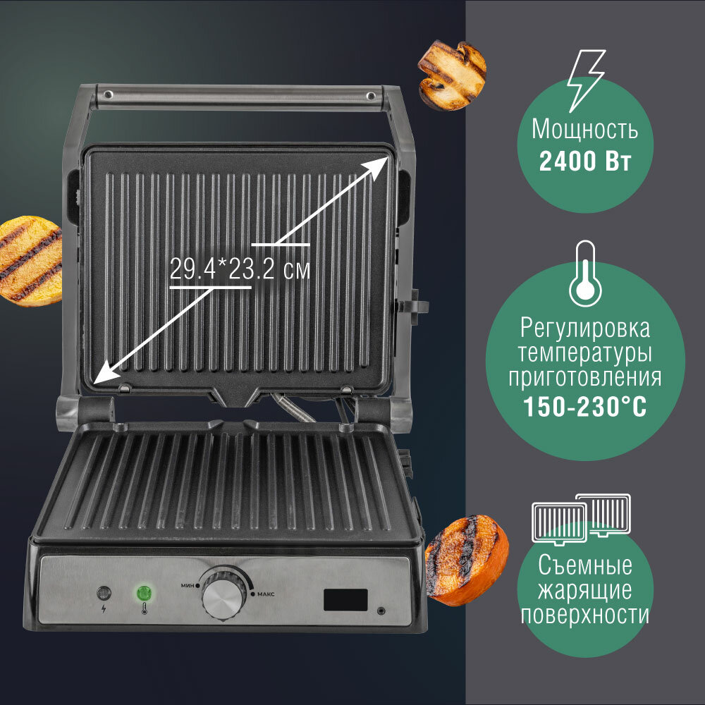 | Дополнительная информация | Съемный термощуп, LED-дисплей, Съемные жарящие поверхности, Ненагревающаяся эргономичная ручка, Открывается на 180°, Индикаторы питания и готовности, Нескользящие прорезиновые ножки регулируемые по высоте |