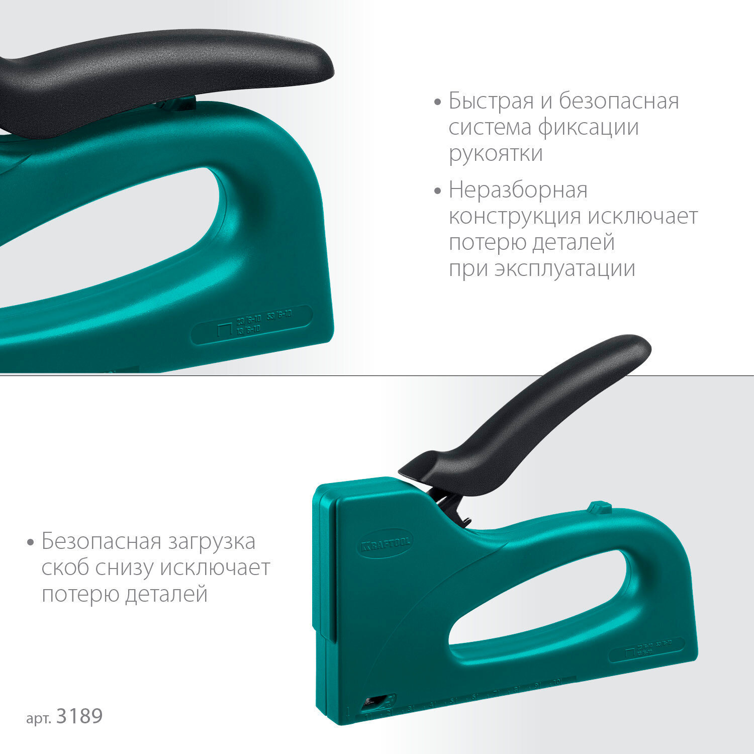 KRAFTOOL STRIKE 3-в-1: 53 (A/10/JT21) 23GA(6-10мм), 13, 23, пластиковый мощный степлер (3189) информация: