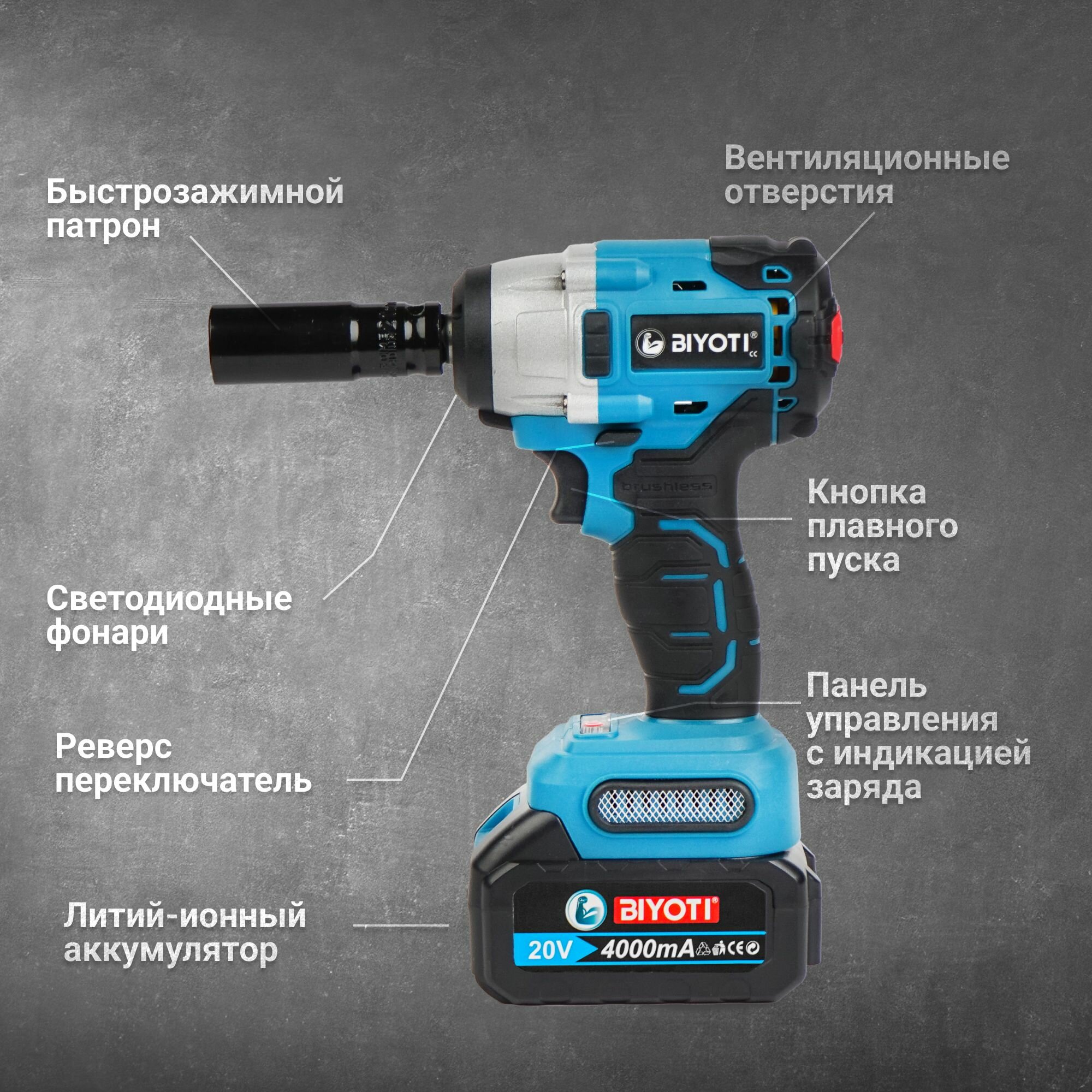Гайковерт аккумуляторный ударный бесщеточный 20В, 350 Нм, BIYOTI / Винтоверт информация: