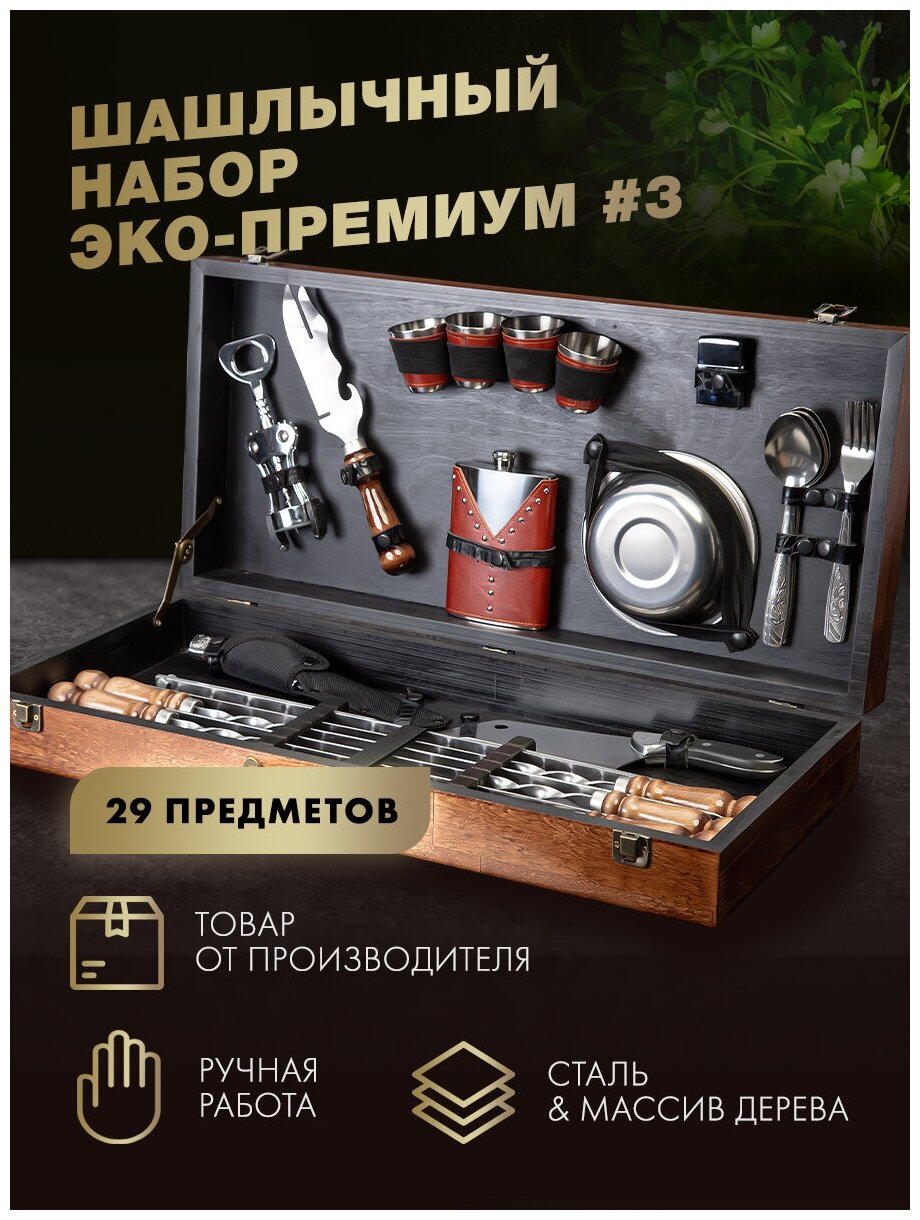 10 цен на Подарочный набор шампуров с деревянной ручкой GLAMKAMP Эко-Премиум #03. Шашлычный набор в кейсе / чемодане для пикника, барбекю, гриля, мангала