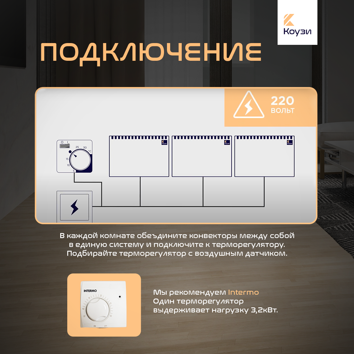 | Особенности | Конвектор может быть подключен к термрегулятору / умной розетке или GSM модулю (в комплекте не предусмотренны) |