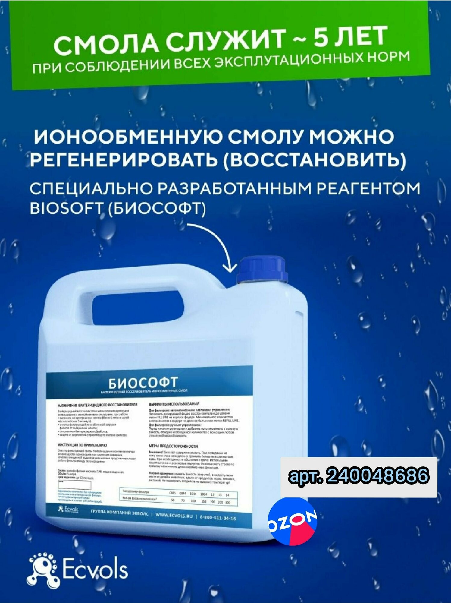 Реагент Ecvols Biosoft Биософт для восстановления ионообменной смолы, очистка от железа, марганца и бактерий, 4 л