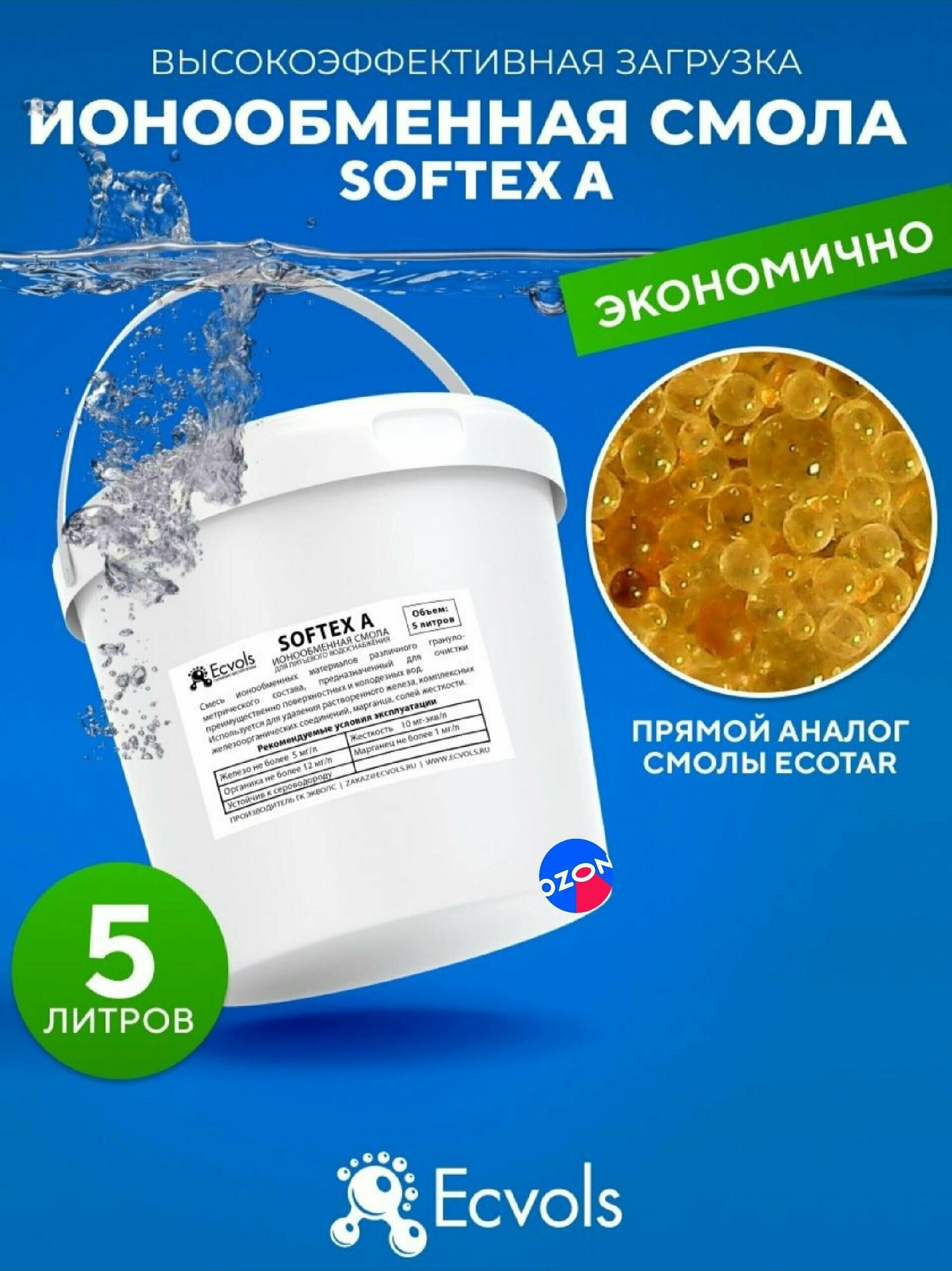 Ионообменная смола микс Ecvols SoftEx A, умягчение воды, удаление железа и марганца, 5 литров информация: