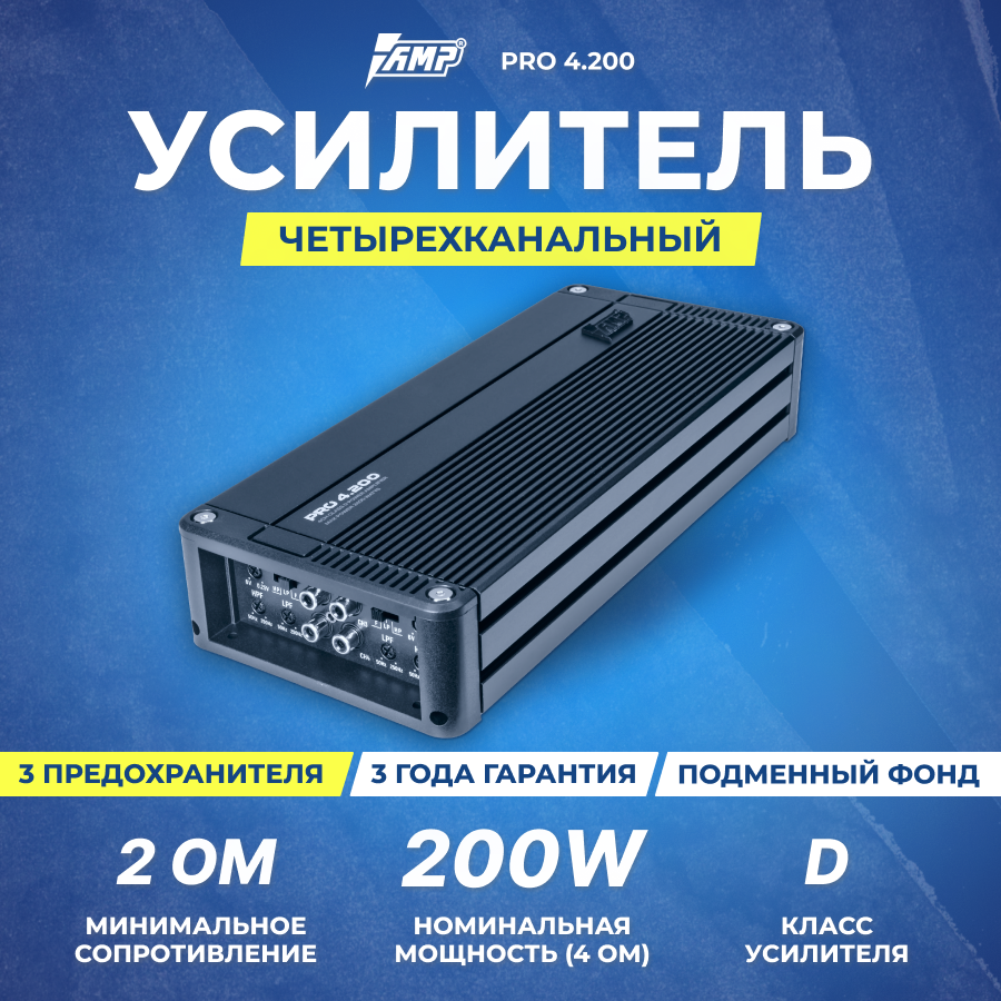 Автомобильный усилитель AMP PRO 4.200 4-кан, класс D , мощность RMS 200 Вт х4 ( 4 Ом ), 300Втх4, ( 2 Ом ) 19 530 ₽