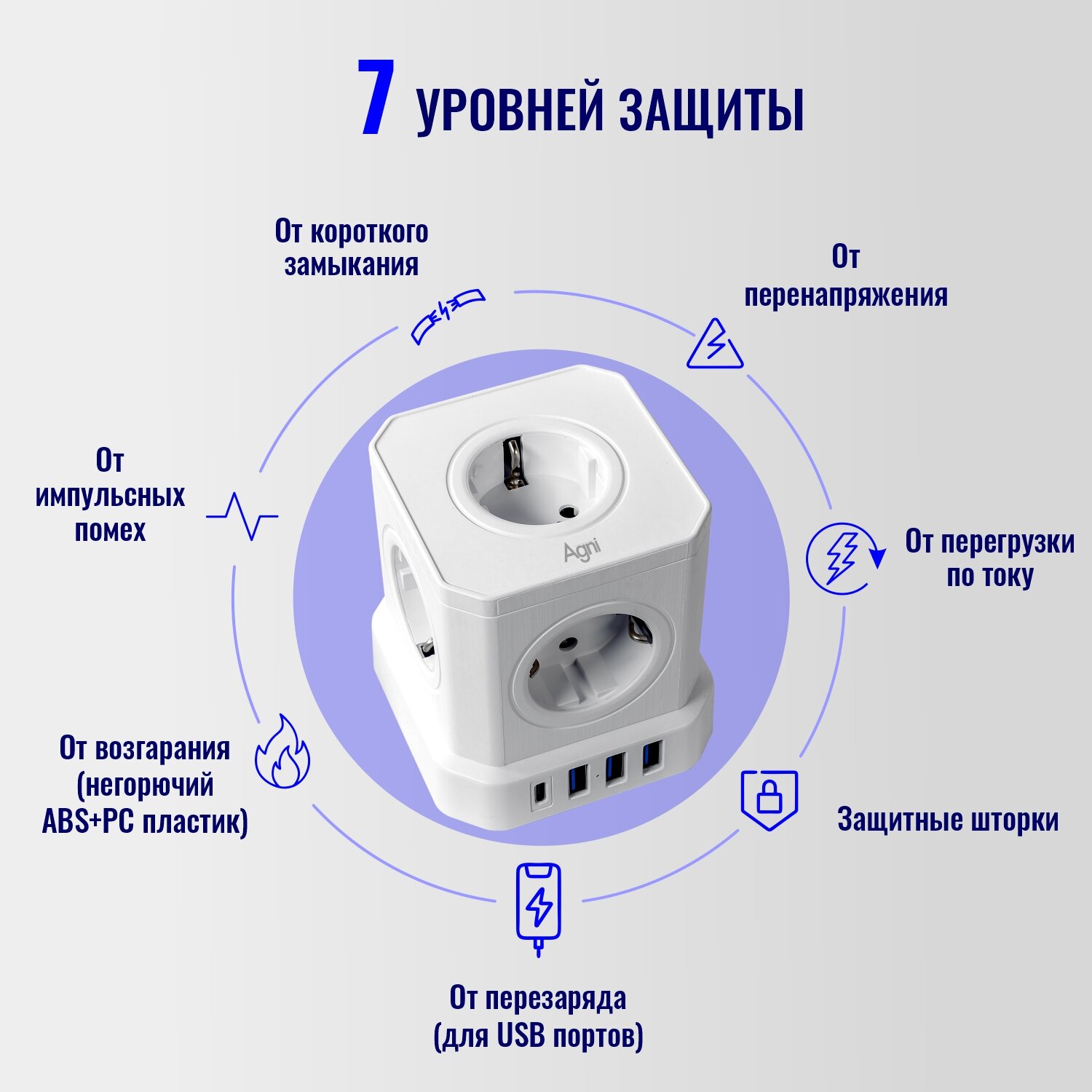 Сетевой фильтр 7 уровней защиты + супер быстрая зарядка 65W AGNI 9 розеток 220V, 4 USB 2.4A, Type-C, заземление, предохранитель 16A, 4 кВт