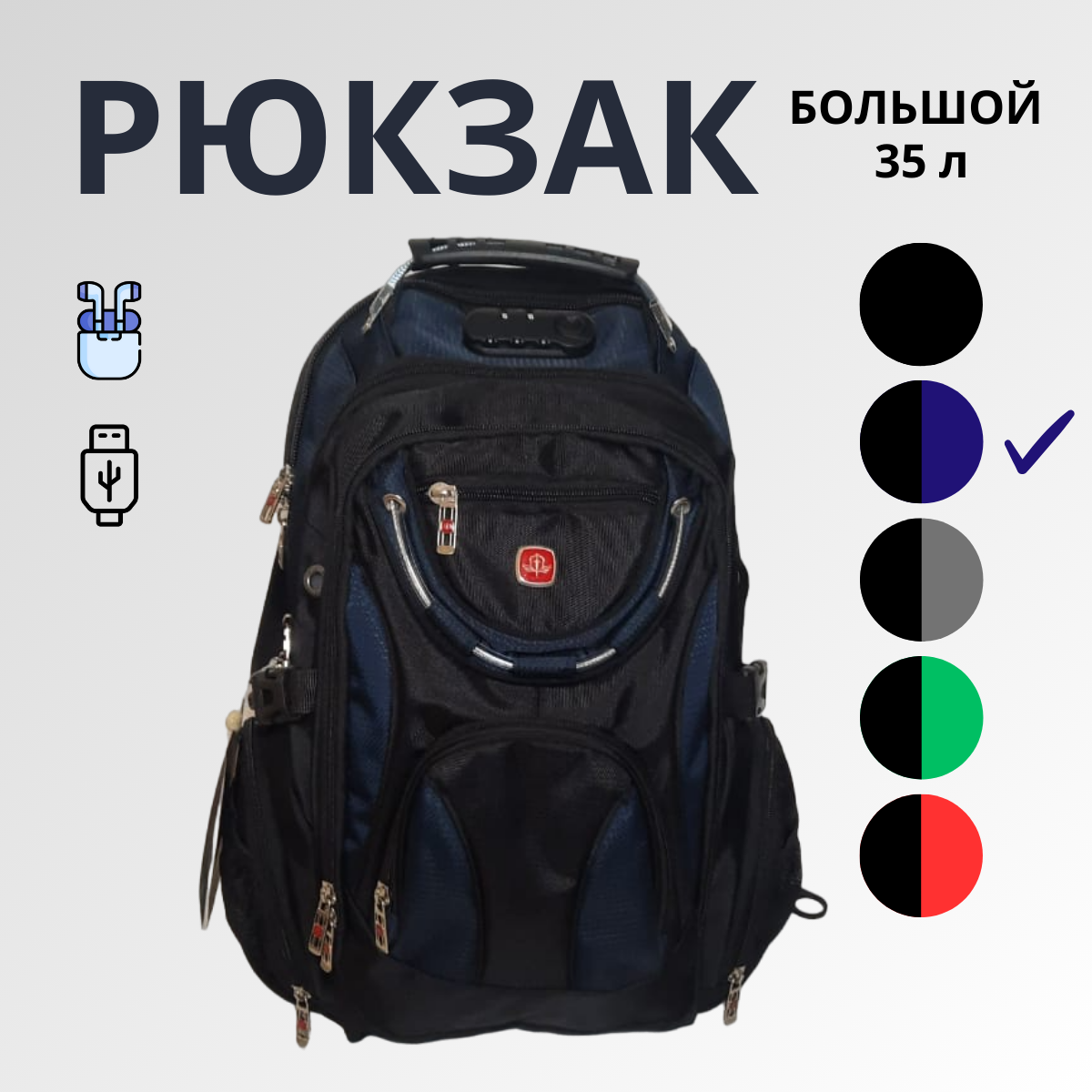 Рюкзак мужской городской спортивный 35л, USB, черный/синий информация: