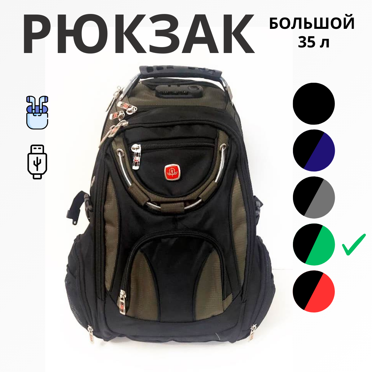 Рюкзак мужской городской спортивный 35л, USB, черный/зеленый информация: