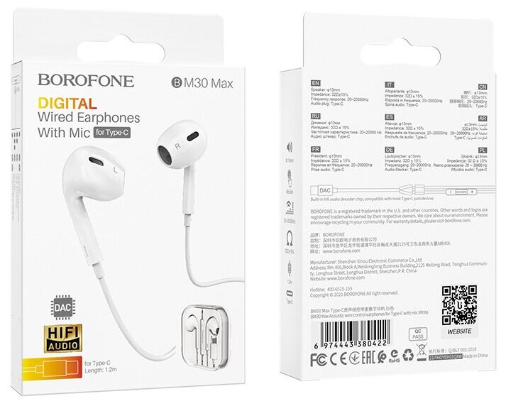 Наушники внутриканальные Borofone BM80 Max, Gorgeous, Type-C, 1.2 м, цвет: белый информация:
