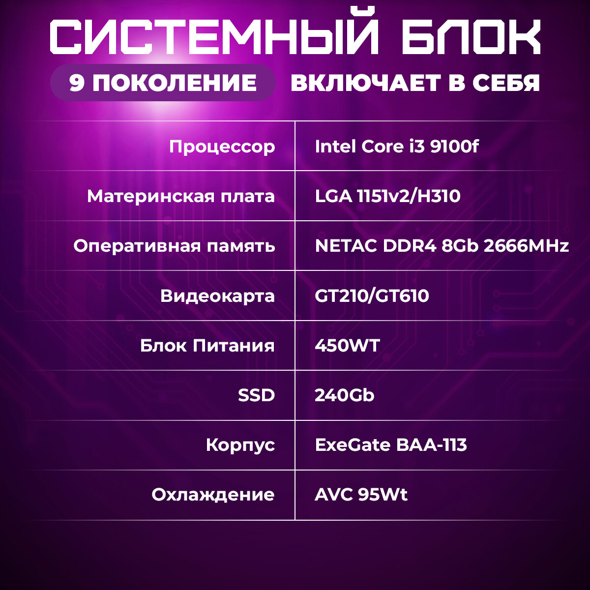Системный блок TREIDCOMPUTERS Офисный Компьютер ПК (Intel Core i3 9100f (3.6 ГГц), RAM 8 ГБ DDR4, SSD 240 ГБ, Nvidia GT 210 1 gb) информация:
