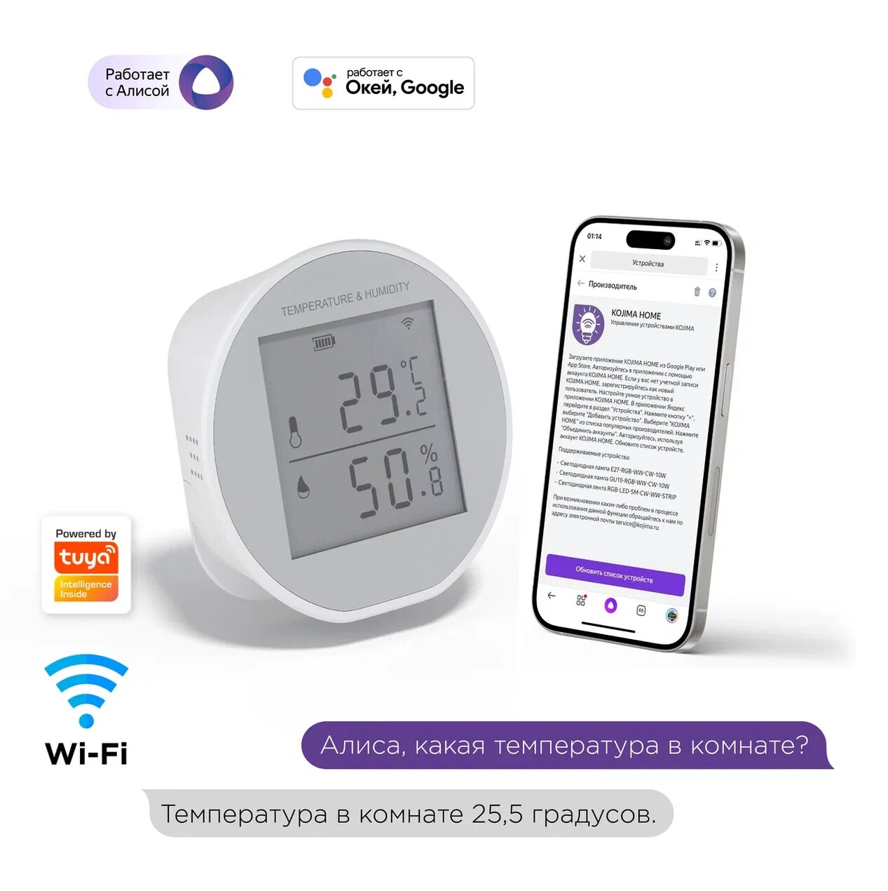 Умный Wi-Fi датчик температуры и влажности с Алисой и Google Assistant информация: