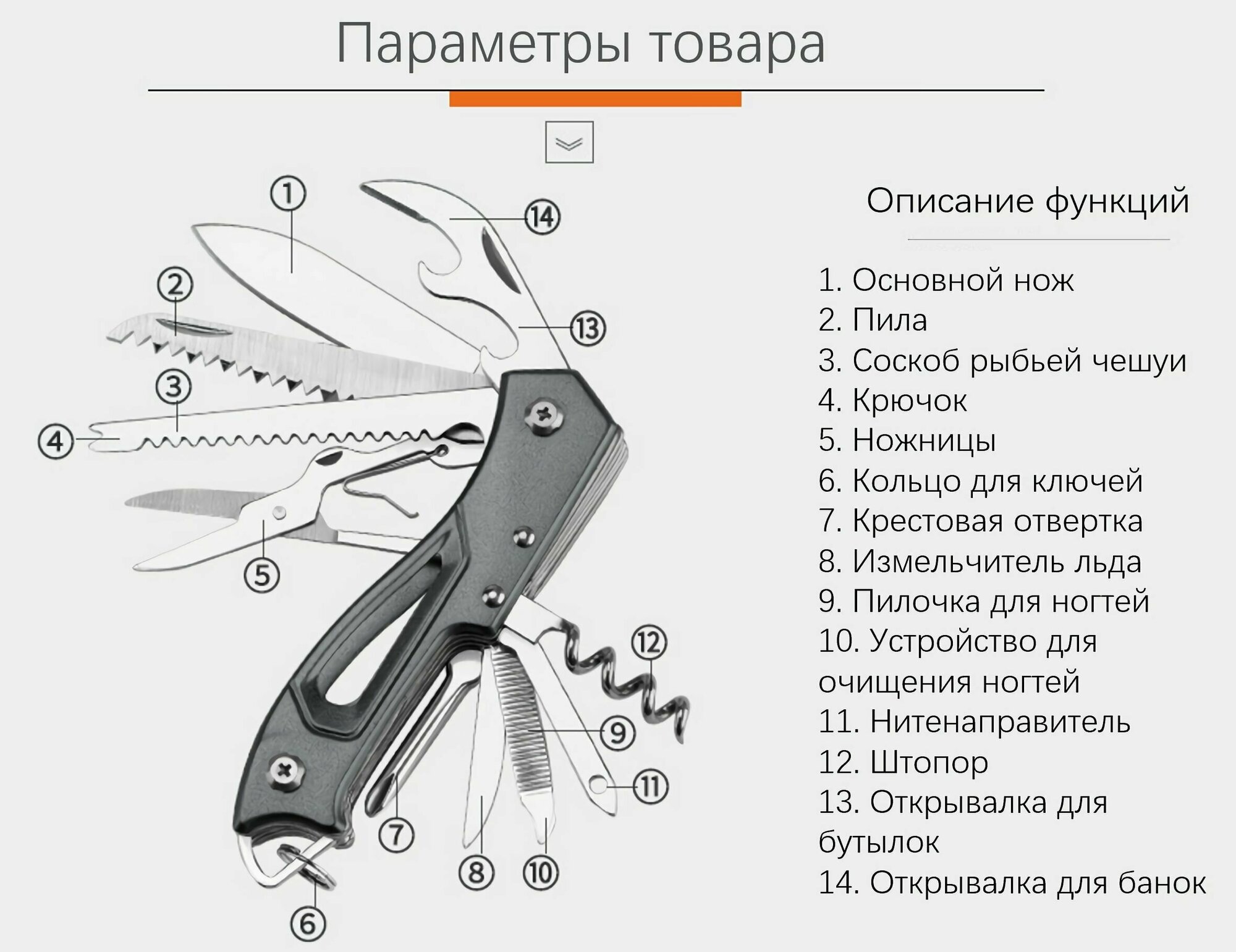 | Инструменты (функции) | кусачки / нож / ножницы / отвертка |