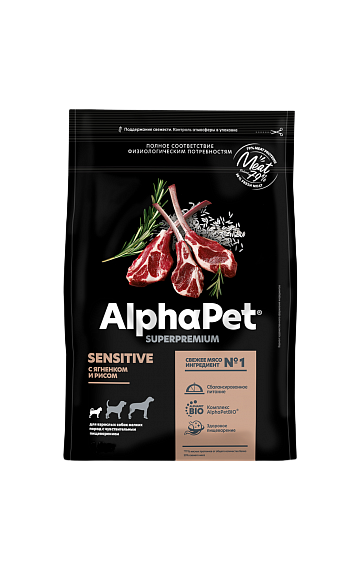 Корм для собак сухой АльфаПет Superpremium Sensitive для взрослых животных мелких пород с чувствительным пищеварением, гранулы с ягненком и рисом