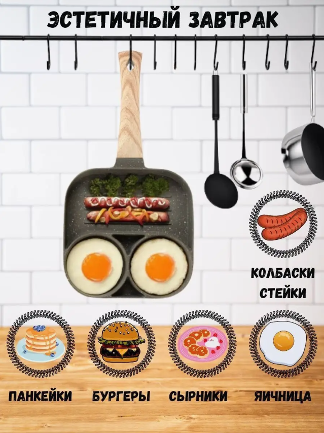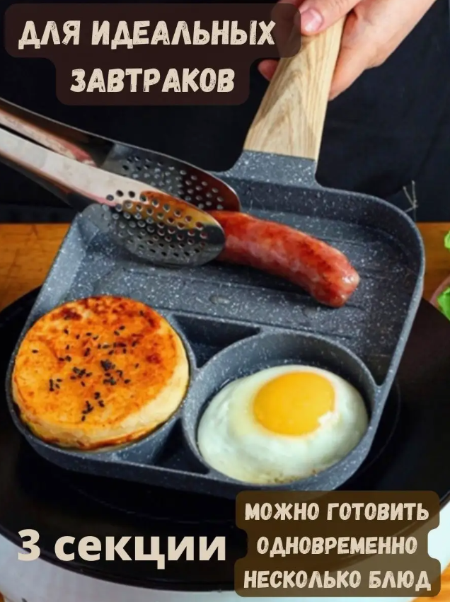 Отзывы на Сковорода, 3 секции , сковорода с 3 отделениями, антипригарное покрытие, съемная ручка, размер 18х18 см , сковорода с секциями