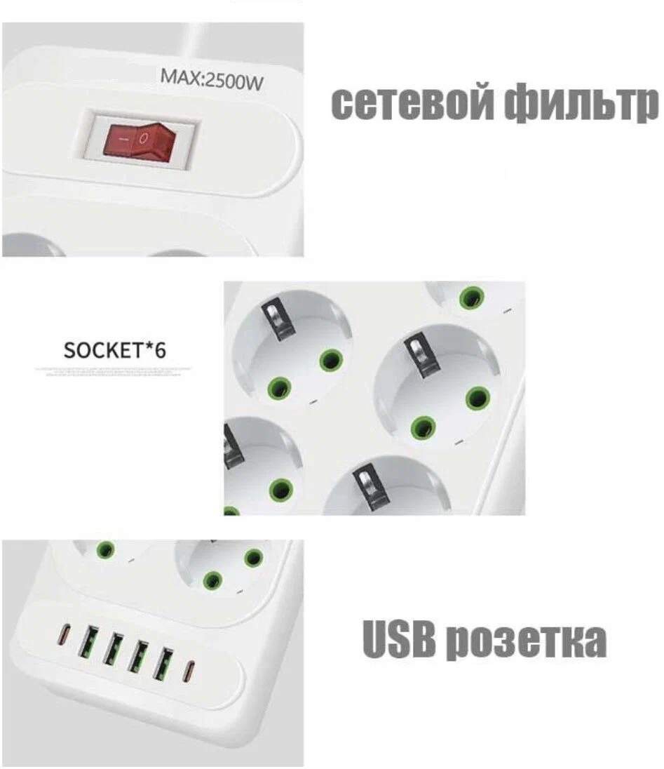 Отзывы на Сетевой фильтр белый, сетевой фильтр удлинитель, сетевой фильтр 4 USB, 6 розеток, 2 USB-C, провод 2 метра, выключатель на корпусе