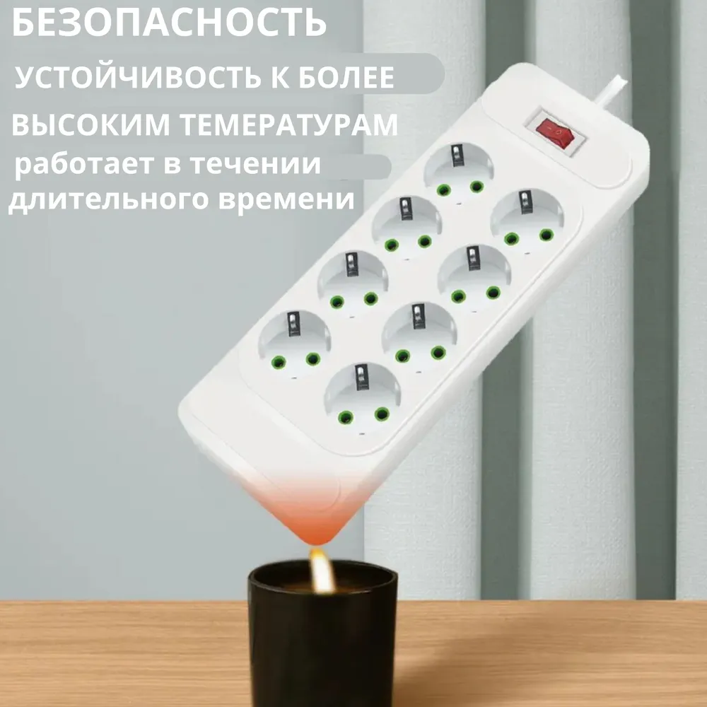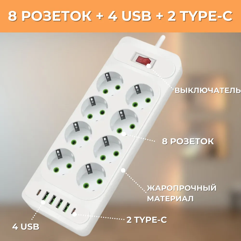 10 цен на Сетевой фильтр белый, сетевой фильтр удлинитель, сетевой фильтр, 4 USB, 8 розеток, 2 USB-C, провод 2 метра, выключатель на корпусе