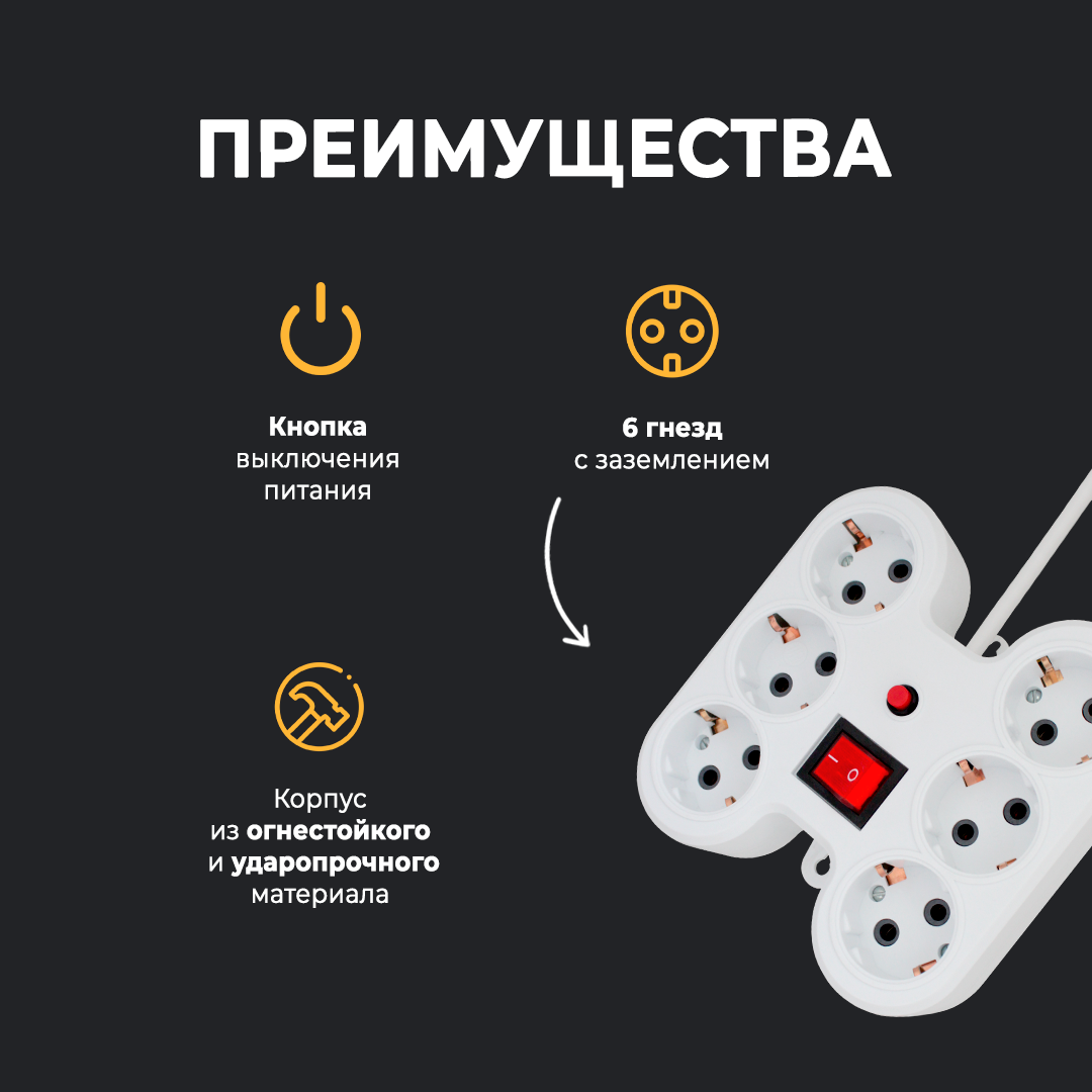 PROGIX Удлинитель сетевой фильтр PG 6 розеток, 5 метров, с заземлением, с выключателем, белый, 10 А, 2000 Вт, без USB, 5 м