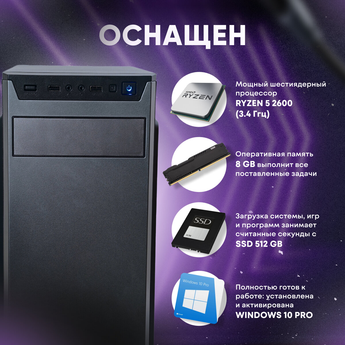 Системный блок AMD R2600 (AMD Ryzen 5 2600 (3.4 ГГц), RAM 8 ГБ, SSD 512 ГБ, NVIDIA GeForce GTX 1650 (4 Гб), Windows 10 Home), черный информация: