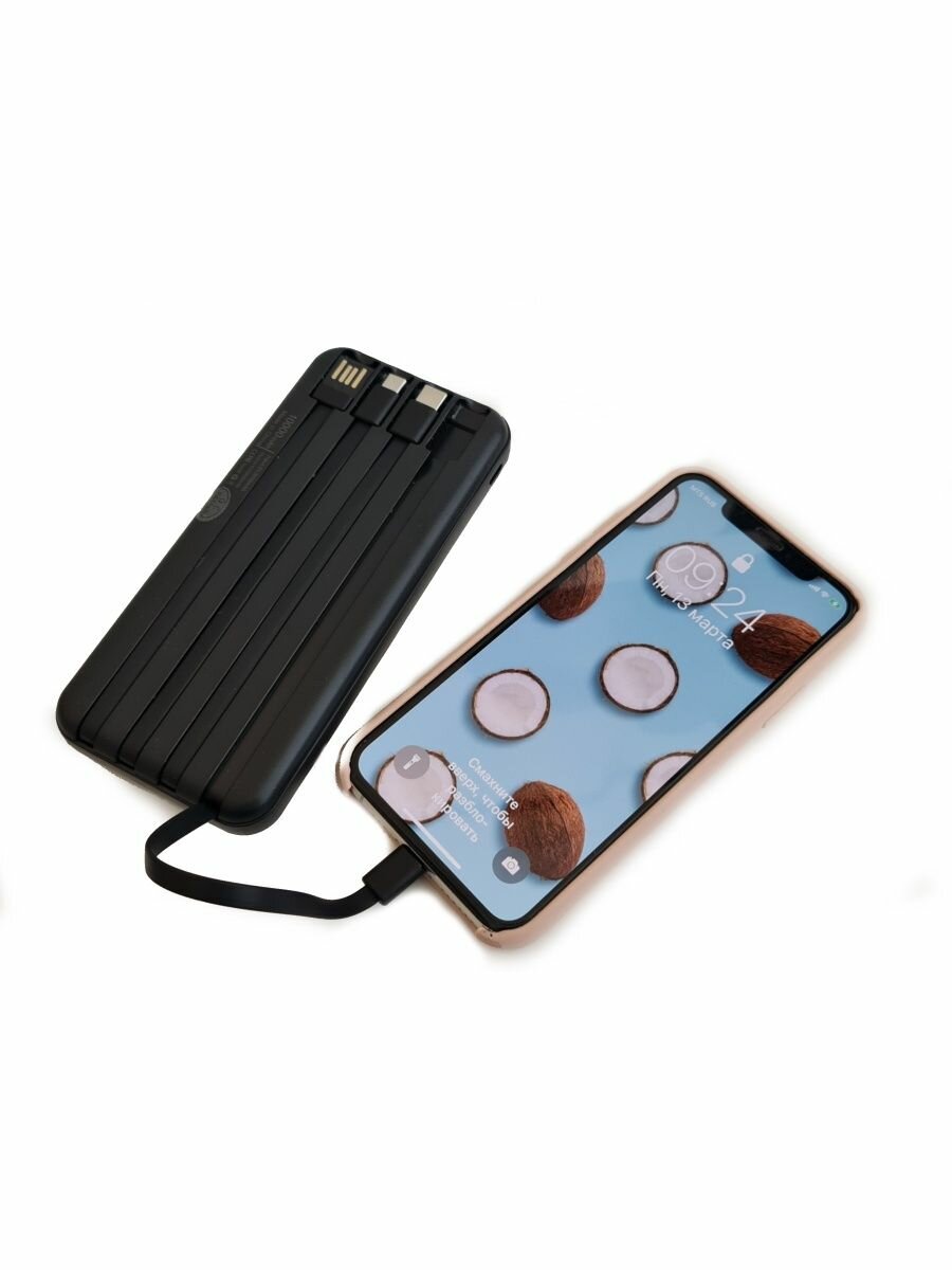 Повербанк, мини портативный внешний аккумулятор PowerBank 5000mAh/4в1+2USB выхода/Lightning для iPhone+Type-C+MicroUSB+USB/яркий фонарик/