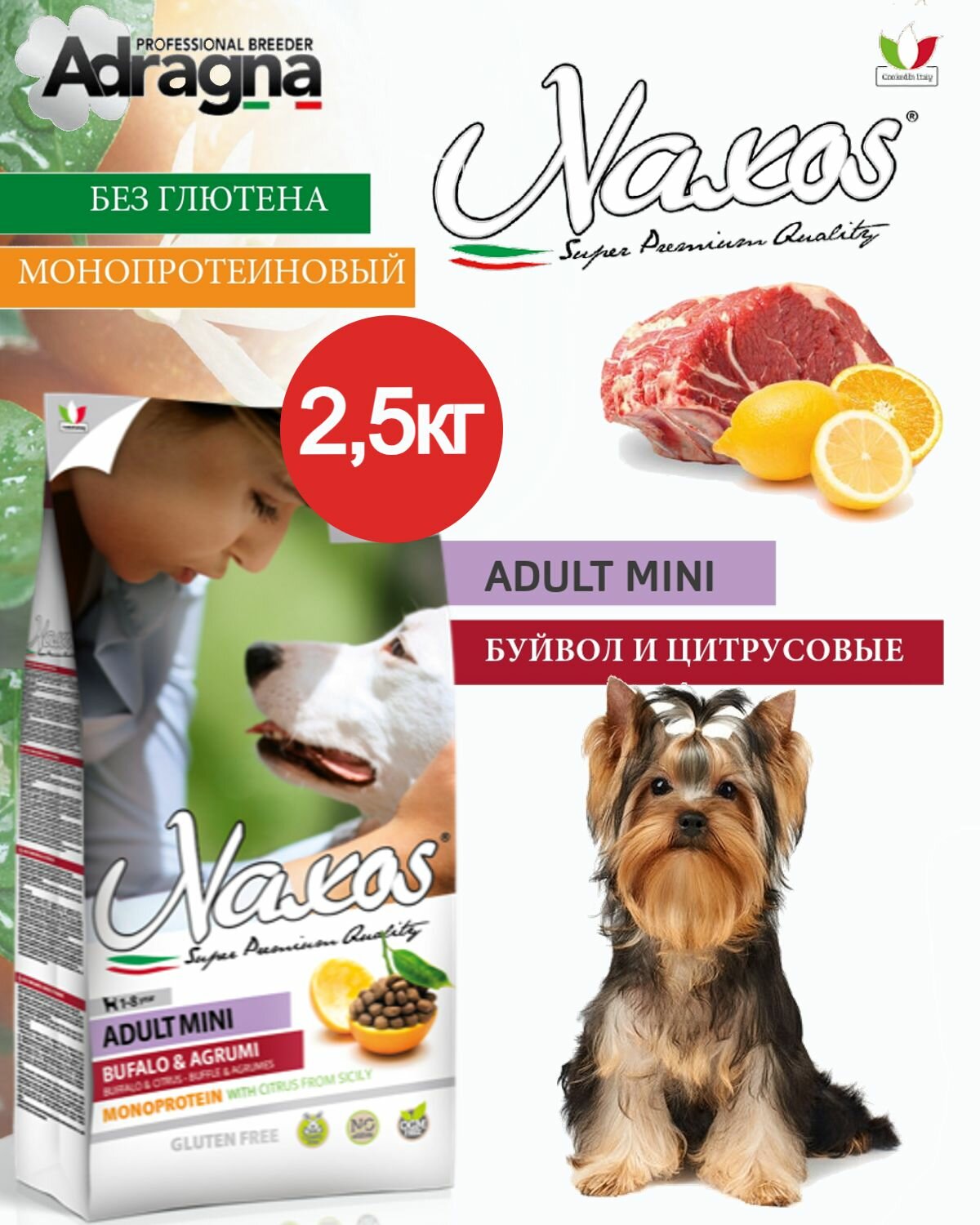 Монопротеиновый гипоаллергенный сухой корм для собак мелких пород супер-премиум класса Naxos Adult Mini (Buffalo & Citrus) буйвол и цитрусовые (2,5кг) информация: