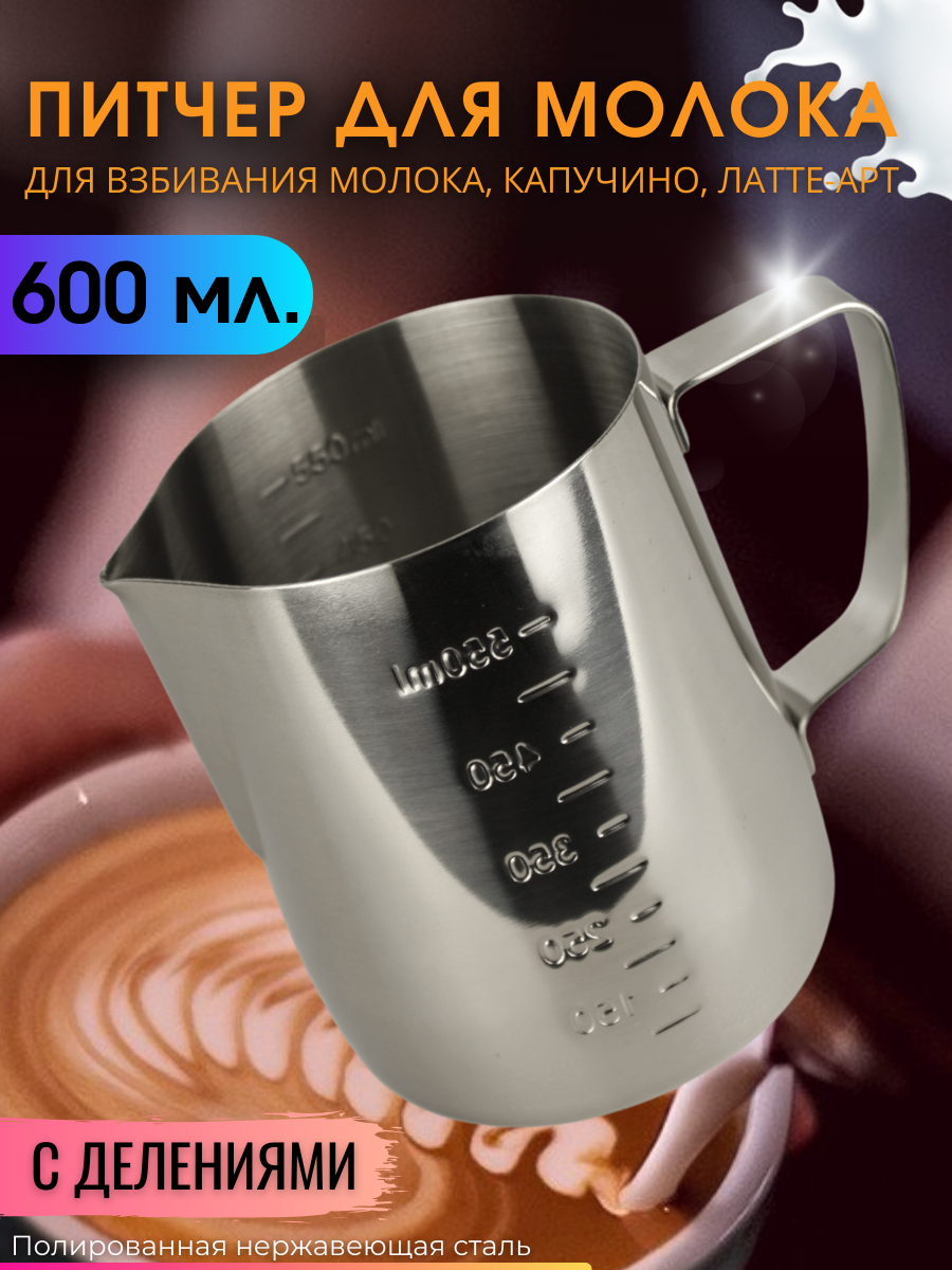 Отзывы на Питчер для молока 600 мл IlleChef с двойной шкалой молочник металлический для кофе, нержавеющая сталь