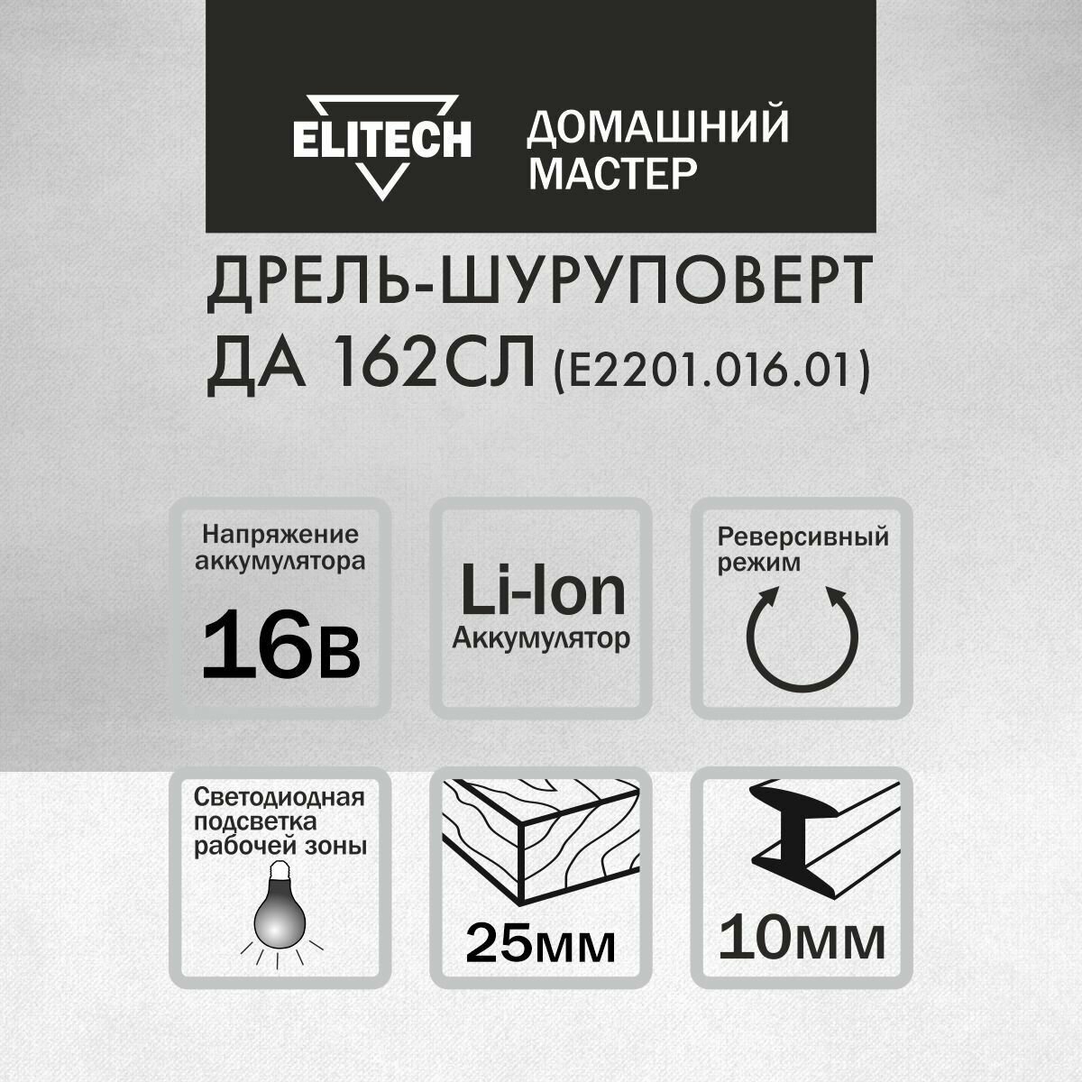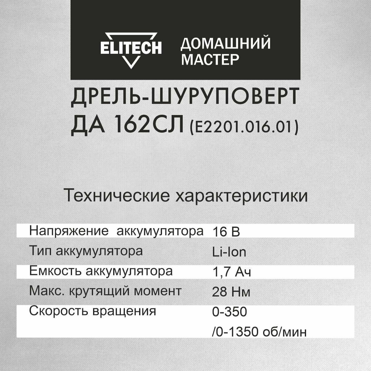 Дрель-шуруповерт Elitech ДА 162СЛ Li-ion в кейсе, 2х1.7Ач, от аккумулятора, 28 Нм информация: