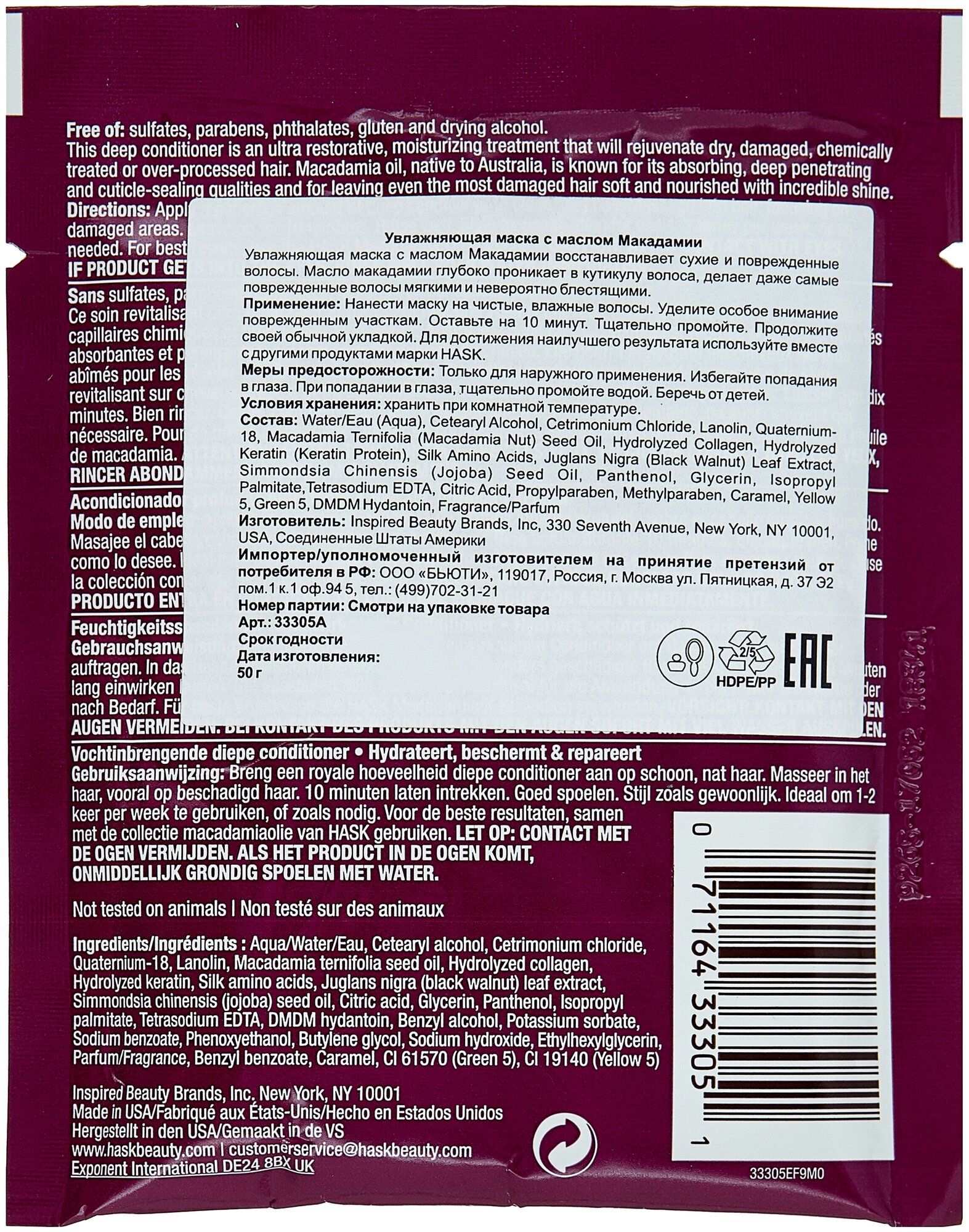 Hask, Маска для волос Macadamia Oil, 50 мл информация:
