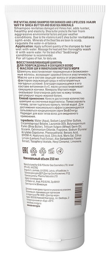 Шампунь Sea&Energy восстанавлювающий для поврежденных и секущихся волос с маслом ши и минералами Мертвого моря, 250 мл информация: